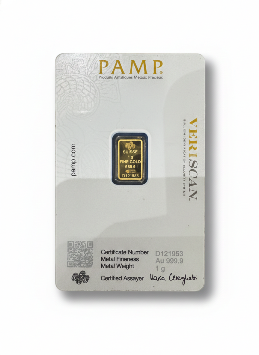 Certified 1g PAMP Suisse gold bar made from 99.99% pure gold. Ideal for small investments and gifting.
